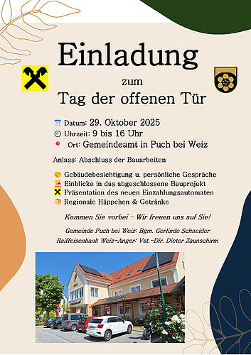 am Mittwoch, den 29. Oktober 2025 von 9 bis 16 Uhr im Gemeindeamt in Puch bei Weiz Anlass: Abschluss der Bauarbeiten * Gebäudebesichtigung u. persönliche Gespräche* Einblicke in das abgeschlossene Bauprojekt* Präsentation des...
