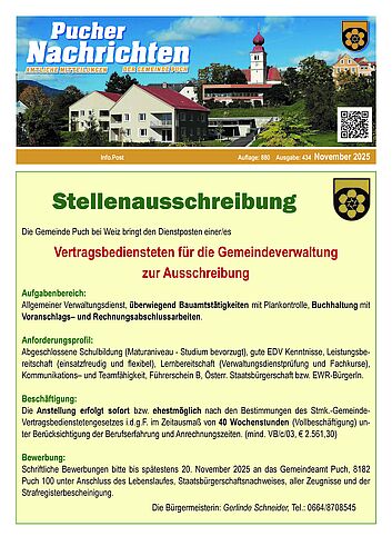 Werde Teil unseres Teams! Die Gemeinde Puch bei Weiz bringt die Stelle eines/er Vertragsbediensteten für die Gemeindeverwaltung für 40 Wochenstunden mit ehestem Dienstantritt zur Ausschreibung (m.w.d.)! StellenausschreibungNähere Informationen bei BGM Gerlinde Schneider unter:...